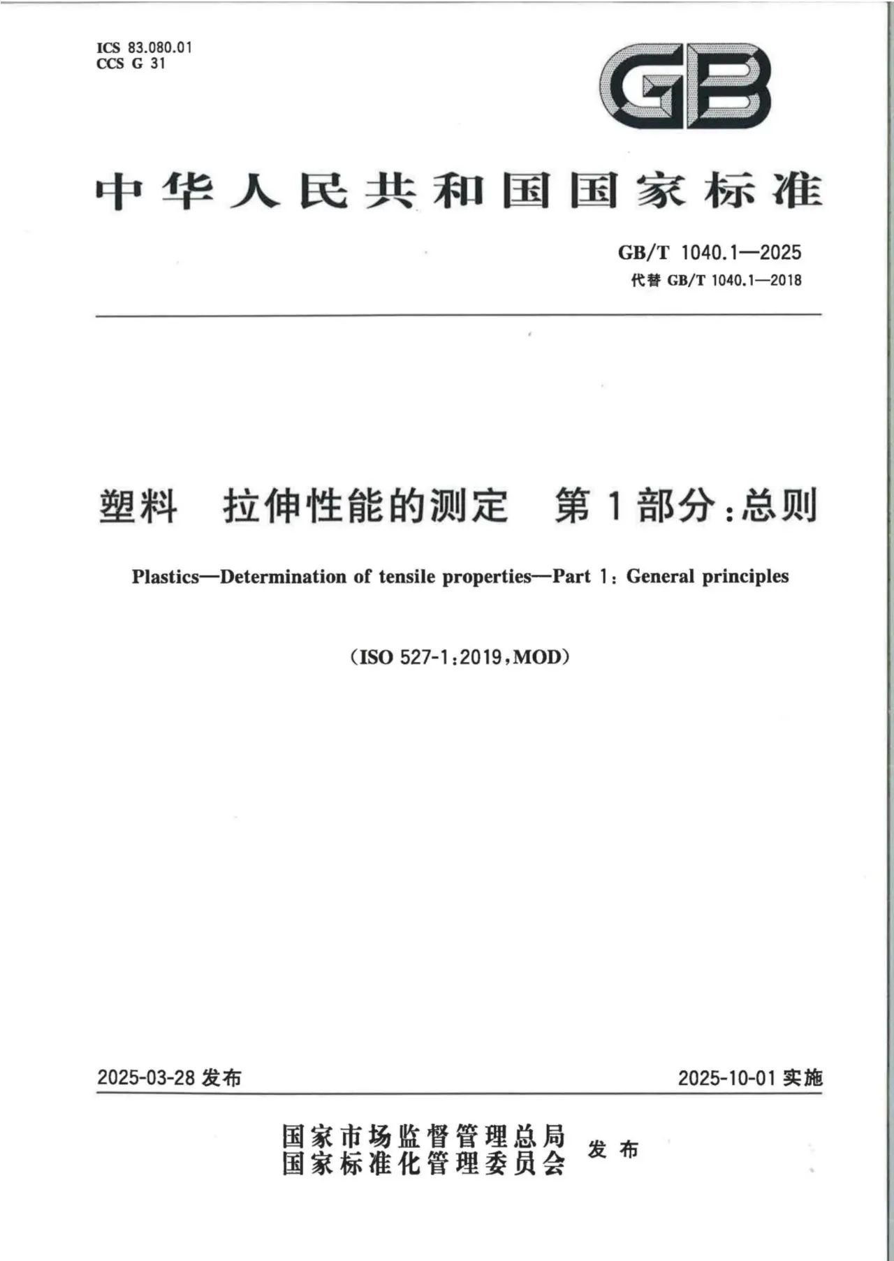 《塑料 拉伸性能的測定 第 1 部分:總則》(GB/T 1040.1-2025)